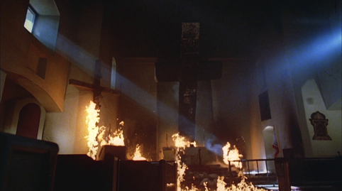 The crucified Jesus begins to bleed and the stone spike shoots out of his wrist straight through Jameson’s forehead. The altar explodes and Stanley rises out of the flames, sword in hand. He is literally floating. He brings the sword down on the colonel and there’s a phenomenal head explosion. Really grisly. The pigs return. Again, it’s tough to make them scary since they don't move super fast, but the puppet heads look mean and they eat a few more of the players. We get fantastic decapitations and it’s like an inferno. I can’t imagine what a mind like Clive Barker could’ve done with this kind of material. Bubba gets it the worst and his death actually comes very unexpectedly. The re-animated corpse of Sarge appears out of nowhere and rips his still beating heart out of his chest, presumably to show Bubba how black it is. A giant cross topples over and the chapel burns to the ground. In real life, the chapel was due for demolition, so when the movie folk were refurbishing it for the final scene, a minister believed they were fixing it, which must have provided him with quite a shock later on. We find out Stanley was the lone survivor of the tragic ‘accident’ and was committed to an asylum. The evil computer turns on and types out “I, Stanley Coopersmith, will return. I WILL RETURN.”