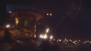 Stanley finds the remains of his puppy and pretty much loses it. He grabs a communion wafer and Hauptman follows him down into the basement. He asks “What the devil do you think you’re doing?,” which is pretty funny. Stanley somehow throws his teacher up onto the ceiling, where he’s impaled on a spiky overhang and his blood flows freely. Stanley fills a golden cup and drinks the blood. Estaban’s face appears over Stanley’s and he briefly looks like a devil pig monster. It’s time to rock and roll and get those dog-killing pieces of shit.