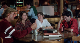When Ed is asked by his often-absent and very alcoholic father to close up his beach condo for the winter, he complains about being treated like a “red-headed bastard.” Ralph scoffs and points to his own head, which is very, VERY brown. Couldn’t they have taken 2 minutes and come up with something else since that line clearly doesn’t apply to this new actor? Or were Buddy Cooper’s words dipped in gold? Ed doesn’t want to go but the group sees an opportunity to get a free beach trip. Ed mutters the horribly clichéd line, “I got a bad feeling about this.” What should then cut to the opening credits instead hops over to a dormitory to pick up Sue. Ralph comes out and claims Sue can’t go, then she comes out. Is this...is this supposed to be a joke? It’s incredible what the film regards as humorous.