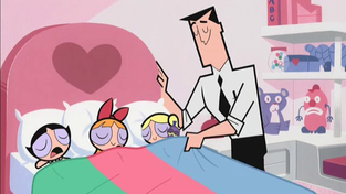 The family dynamic between the Professor and the girls has always been central to the plot of The Powerpuff Girls, and it’s no less touching here, with the film taking a few brief minutes for all of them to adjust to one another. The Professor is particularly adorable since he realizes it’s their birthday so he immediately heads out to buy them gifts but also realizes that “parents don’t leave their kids alone.” It’s established that the girls’ powers are pretty spectacular. They can fly, have super speed, laser eyes, and presumably super strength as well. A scene in which they prepare dozens of peanut butter and jelly sandwiches features a great capper as they use their lasers to remove the dreaded crust off of their yummy sandwiches.
