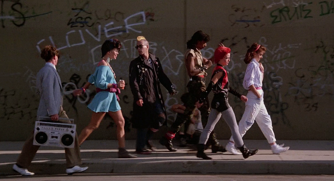 Linnea Quigley’s naked dance to “Tonight (We’ll Make Love Until We Die),” sung by Stacey Q, has become the stuff of legend. It certainly must’ve been shocking for young boys (and girls) everywhere when she doffs her top and her bottoms and dances on top of a gravestone completely nude. Chuck quips “Oh, Trash is taking off her clothes again!” The rest of the punks surround her with road flares (which apparently burned the actor’s hands) and she whips them into a frenzy. Highly amusing is that when producer Graham Henderson arrived, he was aghast because Quigley’s pubic hair was on display. Quigley was led away by the film’s brilliant production designer, William Stout (concept artist, The Mist, Pan’s Labyrinth, Conan the Barbarian), who shaved her, and they returned to the set. Now it was even worse. A plaster cast of her...undercarriage was made and she essentially became as anatomically correct as a Barbie doll. I realize it’s crude to focus so much on this particular detail, but it’s a fascinating insight into the way producers solve and/or make problems.