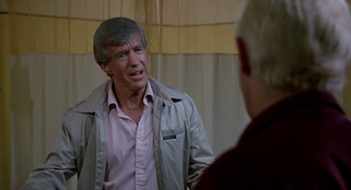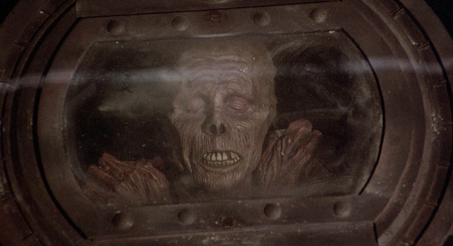 The zombie who bites peck is a half-corpse woman with beautiful blue eyes and some odd zombie tits. This fabulous animatronic effect was created by then-19-year Tony Gardner, who would go on to work on projects as varied as I Come In Peace, Hocus Pocus, and Army of Darkness. Here we get what I believe is one of the most vital ideas ever presented in a zombie film. Ernie, being an expert on death, asks the corpse why she eats people. She replies, “Not people...brains!” Don Calfa brings an excellent, quiet intensity to this interrogation as he digs deeper. She explains that a zombie can feel itself “rot” and brains “make the pain go away.” As an allegory for drugs, it’s smart and on a more simplistic level, it explains the traditional “mute” zombie’s desire to consume flesh.