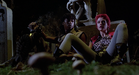 In a rare instance, the cast (with the exception of latecomer Clu Gulager) of Return was given a two-week rehearsal period, very much like Sidney Lumet’s productions had, which results in a uniformly great ensemble. While some characters are better written than others, the actors are clearly having a ball. This is evident in our first introduction to the odd group of punks heading to the warehouse to pick Freddy up. O’Bannon initially expected to cast real-life punk rockers, but ended up with actors who more than make up for their lack of street cred with outrageous performances. There’s de facto leader Suicide (Mark Venturini, notably the ax-wielding maniac who doesn’t want a chocolate bar in Friday the 13th Part V), the death-obsessed Trash (scream queen Linnea Quigley, who was basically cast due to her relationship with casting director Sandi Stokes, who had cast her in the fantastic Silent Night, Deadly Night), Scuz (Brian Peck, The Last American Virgin and dialogue coach), Spider (Miguel A. Nunez Jr., Life, the infamous Juwanna Man, and who was homeless at the time of his casting), slightly-less punk Casey (Jewel Shepard, Hollywood Hot Tubs and whom O’Bannon would meet a strip club), the dorky Chuck (John Philbin, Children of the Corn, Point Break), and the way-too-cute-for-this-crew Tina (Beverly Randolph, who would take a 30-year break from acting after this film and who was freaked out by a meeting with O’Bannon involving a gun and a porno), Freddy’s girlfriend. Their rapport is infectious and after realizing they’ll have to wait two hours for Freddy to get off of work, they break into a condemned cemetery and mess around. This leads to one of Return’s most famous scenes.